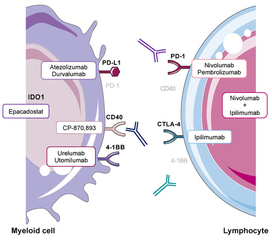 Myeloid and lymphoid cell expression of key targets of cancer immunotherapy associated with hepatotoxicity [5,18,19,20,21,22,23]. Antagonist monoclonal antibody therapies include Nivolumab and Pembrolizumab (anti-PD-1), Atezolizumab and Durvalumab (anti-PD-L1), Ipilimumab (anti-CTLA-4) and combination Nivolumab and Ipilimumab (anti-PD-1 + anti-CTLA-4). Agonist monoclonal antibody therapies are CP-870,893 (anti-CD40), Urelumab and Utomilumab (anti-4-1BB). Small molecule inhibitors targeting IDO1 include Epacadostat.