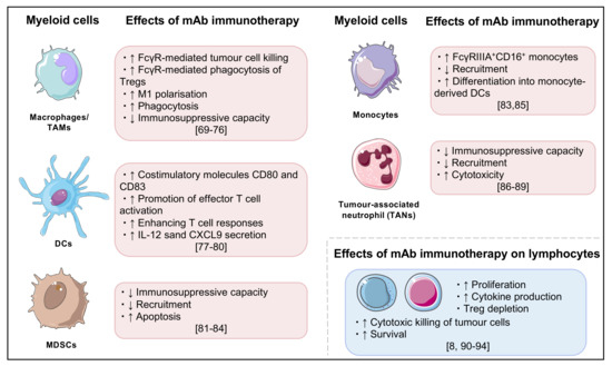 Summary of key effects of monoclonal antibody cancer immunotherapy, particularly on myeloid cells and lymphocytes [69,70,71,72,73,74,75,76,77,78,79,80,81,82,83,84,85,86,87,88,89,90,91,92,93,94].