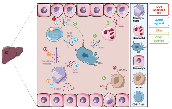 Summary of proposed mechanistic models of hepatoxicity related to cancer immunotherapy. (A,B) Following CD40 agonism, KCs sense IFNγ secreted by CD8+ T cells and activate neutrophils in an IL-12 dependent manner. (C) These neutrophils in turn secrete TNFα leading to hepatocyte damage. (D) CD40 agonism reprograms MDSCs and causes the release of ROS and hepatocyte death. (a–c) CPIs induce the activation of monocytes and highly cytotoxic CD8+ T cells and lead to the formation of inflammatory aggregates associated with hepatotoxicity. (I–III) IDO1 inhibitors in combination with CPIs lead to the activation of CD8+ T cells by MoMFs, their secretion of IFNγ and subsequent hepatocellular injury, as well as the reduction in MDSCs. (1–4) 4-1BB agonism leads to the activation and CCL2/CCR2-dependent liver recruitment of MoMFs. MoMFs promote the activation of KCs, which in turn activate tissue damaging IFNγ secreting CD8+ T cells. MDSC, myeloid-derived suppressor cells; ROS, reactive oxygen species; KC, kupffer cells; MoMF, monocyte-derived macrophages; CPIs, checkpoint inhibitors; GZMB, granzyme B.