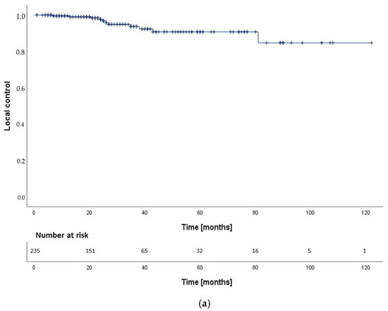 (a) LC after RT in 235 patients; (b) LC after SRS/HFSRT (n = 139) vs. FRT (n = 74) vs. FPT (n = 22) (p = 0.19); SRS-HFSRT/FRT (HR: 0.2, 95%-CI: 0.0–1.5), SRS-HFSRT/FPT (HR: 0.3, 95%-CI: 0.0–4.7) and FRT/FPT (HR: 1.8, 95%-CI: 0.2–14.3).