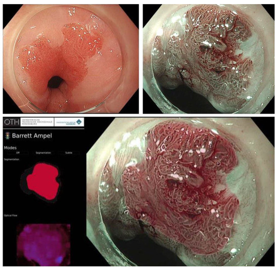 The most straightforward approach would be a computer-assisted diagnosis (CAD) system, supporting the detection of neoplastic lesions during real-time endoscopy. Such a system, if well-trained by expert endoscopists, could increase the performance of any endoscopist by marking the area of interest for further optical evaluation, biopsy, or both. Ideally, the system should not only reliably allow for classification (binary discrimination: non-dysplastic vs. dysplastic) and segmentation (delineation of the dysplastic area), but should also be able to perform these tasks in real-time (with a frame rate comparable to that of standard video endoscopy—i.e., ca. 70 frames/second). Eight studies have evaluated the performance of such systems on still images and, in some pilot studies, on real-time video endoscopy. All groups used deep learning methods to train their AI systems with high-quality images annotated by experts. Pioneering work from Augsburg analyzed the performance of a deep learning system to detect and delineate early adenocarcinoma (Figure 2). The performance for HD-WLE on two different image sets yielded sensitivities and specificities of 92–97% and 88–100%, respectively. One image set was also evaluated for narrow-band imaging (NBI), with a sensitivity and specificity of 94% and 80%, respectively. Using tumor margins delineated by experts, the Dice coefficient (F1 score) was 0.72, indicating a good overlap between predicted segmentation and ground truth [21]. In a subsequent study, this AI system was evaluated during video endoscopies of 14 cases with neoplastic Barrett’s esophagus and showed an impressive predictive accuracy of 89.9% [22]. In a similar study, a deep learning system was developed, validated, and subsequently compared with the performance of a group of international experts. The system detected Barrett’s neoplasia in still images with a higher accuracy than experts and showed a near-perfect delineation of the lesions [23]. The system was also tested in a pilot study during real-time endoscopy on 20 patients with a comparable performance (accuracy, sensitivity, and specificity of 90%, 91%, and 89%, respectively) [24]. In another study, a trained CNN detected early Barrett’s neoplasia with high sensitivity, specificity, and accuracy in real-time videos. The system could also locate the dysplastic areas with high precision and speed [25]. Finally, a Japanese group developed an artificial intelligence system for the diagnosis of early cancer at the esophageal-gastric junction. A total of 1172 images from 166 cancer cases and 2271 images of normal mucosa from 219 patients were used as training data. The system was then validated using 232 images from 36 cancer cases and 43 non-cancerous lesions. Sensitivity, specificity, and accuracy of the AI system (94%, 42%, and 66%, respectively) compared favorably to that of the performance of board-certified experts [26] (Table 1). The performance of different popular object detection algorithms (all using CNN) was compared using 100 HD-WLE images from 39 patients annotated by experts as ground truth. The single-shot multibox detector (SSD) algorithm outperformed other methods, with a sensitivity of 96% and a specificity of 92% for the identification of early esophageal adenocarcinoma [27].