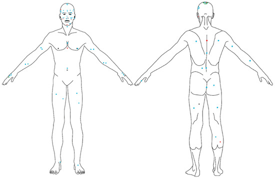 Anatomical distribution of different histopathological subtypes of blue nevi analyzed in the study. Blue dots represent common blue nevi; red dots, combined blue nevi; green dots, cellular blue nevi; black dots, desmoplastic blue nevi.