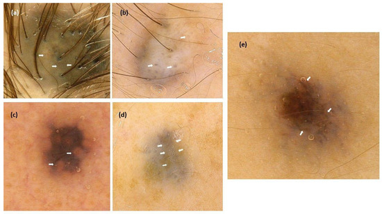 Examples of dermoscopic structures observed in the study, whose prevalence was not previously reported in the context of blue nevi (arrows). (a). Skin-colored circles; (b). Gray circles; (c). Follicular ostia with no pigmentation; (d). Blue prominent skin markings over blue-gray background; (e). Polygons.