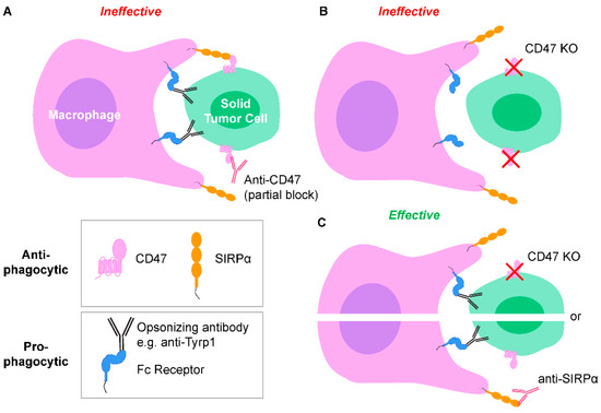 CD47-SIRPα signaling and pro-phagocytic cues between macrophages and solid tumor cells. (A) Fc regions of tumor-opsonizing antibodies bind to Fc receptors on macrophages, and Fab regions bind to tumor cell antigens. These signals act as a pro-phagocytic cues, but phagocytosis is ineffective when CD47 is only partially blocked by anti-CD47. (B) Complete knockout (KO) of tumor cell CD47 to ablate CD47-SIRPα signaling without a pro-phagocytic signal results in ineffective phagocytosis. (C) Both tumor cell CD47 KO (or anti-SIRPα block on macrophages) and tumor-opsonizing antibodies results in effective phagocytosis.