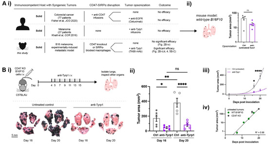 Tumor-opsonizing antibodies can drive regression of metastases only when CD47 is disrupted. (A) (i) Human clinical CD47 blockade in solid tumors compared to our main design of a suitable preclinical model (mouse). Anti-CD47 monotherapies show no efficacy, motivating a combination with tumor-opsonizing antibodies (e.g., Cetuximab in colorectal cancer). Anti-Tyrp1 monotherapy also showed no efficacy against human melanoma. Two distinct approaches are taken in our model. (ii) Anti-Tyrp1 opsonization of established wild-type (WT) B16F10 melanoma metastases does not significantly affect lung tumor burden on day 14 after tail-vein inoculation with 2 × 105 B16F10 cells. Tumors are allowed to establish, and mice are then tail-vein injected with anti-Tyrp1 (250 µg dosing) on days 4, 5, 7, 9, 11, and 13. Mice are sacrificed and organs are surveyed for B16F10 metastases. Results are illustrative of three independent experiments (n = 5 per group, mean ± s.e.m., n.s. not significant for p > 0.05, unpaired t-test). (B) CD47-deleted lung metastases require anti-Tyrp1 for significant suppression. (i) Mice are tail-vein injected with 2 × 105 CD47 KO B16F10 cells on day 0 and later treated by tail-vein injections of anti-Tyrp1 (75 µg dosing). Mice are sacrificed and organs are surveyed for metastases, but only the lung shows nodules. Representative images from untreated controls or anti-Tyrp1 treatment. (ii) Tumor area on both sides of lung lobes were quantified, showing significant suppression by anti-Tyrp1 (n = 5 per group, mean ± s.e.m.; * p < 0.05, ** p < 0.01, **** p < 0.0001, one-way ANOVA, uncorrected Fisher’s LSD). (iii) Exponential-type growth (as power law: Area = A0 tB: A0,ctrl = 0.0019, A0,tx = 0.0087, Bctrl = 4.1, Btx = 3.0). (iv) CD47 deletion does not affect tumor growth relative to WT (Area = A0 ek*t, where A0 = 0.05, k = 0.45).