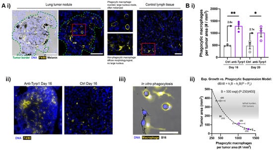 Tumor-opsonizing antibodies increase macrophage infiltration in tumors. (A) Phagocytic macrophages in treated CD47 KO lung tumor nodules. (i) Confocal images of anti-Tyrp1-treated CD47 KO tumors show F4/80+ macrophages that are rounded in morphology and contain melanin and large DAPI+ nuclei, indicating phagocytosis of B16F10 cells. F4/80+ macrophages in control lymph tissue (lymphatics-localized) show diffuse, non-phagocytic morphology. (ii) Treated lung nodules show more phagocytic macrophages than untreated control lungs. (iii) Rounded macrophage in vitro after engulfing an opsonized B16F10 cell. Scale: 50 µm. (B) (i) Phagocytic macrophages per tumor area increase with anti-Tyrp1 treatment in CD47 KO lung tumor nodules. Mean ± s.e.m. (* p < 0.05, ** p < 0.01, Student’s t-test, n = 3 representative samples per group, closed circles indicate day 16 samples and open circles indicate day 20 samples). (ii) Relationship between the lung tumor area and density of phagocytic macrophages: exponential-type growth versus phagocytic suppression. Tumor burden, B, is modelled by an ordinary differential equation in which growth is suppressed by phagocytic interactors, P. P0 refers to inactivated macrophages.