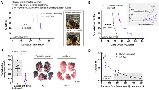 To directly assess survival, we followed small cohorts of untreated and treated mice over time. All untreated mice with CD47 KO lung metastases exhibited numerous clinical symptoms that required euthanasia (hunched posture, slow movement, labored breathing), whereas mice treated with anti-Tyrp1 showed a median survival ~30% longer (Figure 4A). Furthermore, untreated controls all required sacrifice within a narrow window of 2–3 days (at ~23 days), whereas all mice in the treatment group survived longer, with a large variation and 20% surviving up to 2-fold longer.