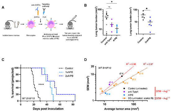 SIRPα-blocked, Tyrp1-targeted marrow cells suppress wild-type metastases, while anti-Tyrp1 treatment alone does not. (A) Schematic of SIRPα-blocked, Tyrp1-targeted (A’PB) fresh marrow cell production for tail-vein infusion into mice with WT B16F10 lung metastases. Monocytes and macrophage pre-cursors are the main marrow cells with SIRPα and Fc receptors, and the latter are pre-loaded with anti-Tyrp1 prior to infusion. Mice receive 2 × 107 antibody-engineered marrow cells intravenously on day 4 (1× A’PB) and 6 (2× A’PB). Additional anti-Tyrp1 was administered i.v. on days 4, 5, 7, 9, 11, and 13 (250 µg doses). (B) WT B16F10 tumor burden in mice treated with antibody-engineered marrow. Left: Control mice were treated with either isotype IgG2a antibody (gray, 250 µg dosing regimen) or received no treatment (black), while treated mice received either anti-Tyrp1 (250 µg dosing regimen) or A’PB marrow with anti-Tyrp1 (250 µg dosing regimen). Mean and s.e.m. (* p < 0.05, n.s. not significant, ordinary one-way ANOVA, n = 5 per group except isotype control n = 4). Right: Tumor burden in a separate experiment comparing control (untreated) or 2× A’PB groups. Lung tumor burden was assessed on day 14 post-inoculation. Mean and s.e.m. (* p < 0.05; this data is part of the experiment in Figure 7B, which describes the statistical test). (C) Projected survival advantages in A’PB-treated lung tumors. (n = 10 for control group, n = 5 per treatment group, **** < 0.0001, Log-rank test). (D) Variance of tumor areas scales with average tumor area of lung nodules, consistent with power law growth.