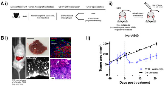 To assess the A’PB antibody-engineered marrow macrophages/monocytes in a second metastatic model and to assess relevance to humans, liver metastases of human lung cancer A549 tumors were first established in immunocompromised NSG mice (Figure 6A,B), as previously described by our group [31]. A549 expression of tdTomato enables imaging of infiltrative nodules after engraftment in liver via surgical implantation (Figure 6Bi,ii). Macrophages in NSG mice express a SIRPα variant that favors engraftment of human cells due to its high affinity with human CD47, but NSG mice lack antibodies and functional T cells, B cells, and NK cells [32,33]. Compared to B16F10 tumors that show exponential phase growth from 100 to 200 mm [2] in 2–3 days (Figure 2Biv), A549 tumors grow more slowly with linear growth to the same extent in ~2 weeks (Figure 6Biii).