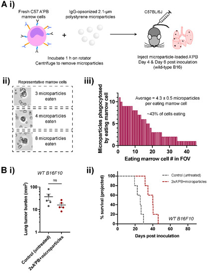 Pre-loading A’PB with microparticle cargo hinders tumor suppression. (A) Antibody-engineered macrophages/monocytes pre-loaded with cargo prior to treatment. (i) Schematic of in vivo marrow pre-load therapy to assess off-target effects on phagocytosis. Freshly harvested marrow cells phagocytose IgG-opsonized polystyrene microparticles for 1 h prior to tail-vein injections. (ii) Representative images of marrow cells with polystyrene microparticles, with excess particles removed by centrifugation prior to injection. (iii) Quantification of microparticles engulfed per marrow cell in a field of view (FOV). About 40% of marrow cells engulfed up to ~10 particles. (B) In vivo phagocytosis of WT B16F10 cells in A’PB marrow treatments. (i) Lung tumor burdens in control (untreated) and 2× A’PB + microparticle pre-loaded groups. Mice were treated with antibody-engineered marrow on days 4 and 6 in addition to tail-vein injections of 250 µg anti-Tyrp1 per Figure 2B through day 13. Mean and s.e.m. (n.s. not significant, Ordinary one-way ANOVA with Dunnett’s multiple comparisons, n = 5 per three groups, including 2× A’PB in Figure 5B). (ii) Projected survival curves.