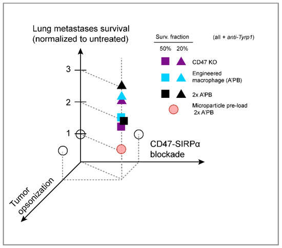 Here, we show that CD47 ablation is insufficient on its own to affect tumor progression in a poorly immunogenic, metastatic model that is widely used as a pre-clinical model. Our KO and WT control tumors across various B16F10 lung metastases indicate a consistent median survival of ~20–25 days that reflects exponential-like growth (Figure 4A,B for CD47 KO and Figure 5C and Figure 7B for WT B16). Clinical trials also show that CD47 monotherapy is rarely, if ever, effective against human cancer [4,5]. Anti-CD47 blockade in combination with a second opsonizing mAb can show efficacy in the clinic against liquid cancer, but solid tumors likely present larger barriers and limits to anti-CD47-based blockade even in combination treatments. Similarly, subcutaneous B16F10 tumors treated with anti-Tyrp1 show little to no effect of anti-CD47 [24,25]. Our CD47 knockout is 100% (rather than incomplete per earlier studies), and a combination with the tumor-opsonizing IgG TA99 proves effective against established lung metastases of B16F10s. The effect is consistent and significant, with survival extended 2–3-fold across several different studies (Figure 8). Our anti-SIRPα blocked macrophages also proved to be effective in combination with tumor opsonization.