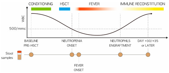 This prospective, multi-center study enrolled pediatric patients undergoing allo-HSCT in three pediatric centers in Europe (Bologna, Italy; Verona, Italy; Wroclaw, Poland) between January 2019 and December 2020. Inclusion criteria were age ≤ 18 years and informed consent provided. Exclusion criteria included previous fecal microbiota transplantation. Enrolled patients could be candidates for HSCT for any underlying condition, with any HSCT characteristics. The sampling protocol was approved by the Ethics Committee of the CE-AVEC of Emilia-Romagna, Italy (ref. number 19/2013/U/Tess). The study was conducted in accordance with the Declaration of Helsinki. Stool samples were collected at baseline (before transplant; hereafter referred to as PRE); at the onset of neutropenia (day −2/+2; P2); at the onset of fever (day +4/+5; P5); at engraftment (absolute neutrophil count (ANC) ≥ 500 × 106/L for at least 3 days; TAKE) and after engraftment (day +20/+30; P20). Stool samples were collected in sterile tubes and stored at −80 °C and shipped in dry ice to the Department of Pharmacy and Biotechnology (FABIT), University of Bologna, Italy where the analysis was performed. Neutropenia was defined as ANC < 500 × 106/L and fever was defined as a body temperature ≥ 38 °C proven by two different determinations. Episodes of BSI were defined as positive cultures from a blood sample from both the central venous catheter and peripheral veins.