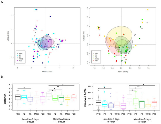 Gut microbiota diversity in pediatric allo-HSCT patients with different duration of febrile neutropenia. (A) PCoA based on weighted UniFrac distances between the gut microbiota profiles of samples collected before transplant (PRE), at the onset of neutropenia (day −2/+2; P2), at the onset of fever (day +4/+5; P5), at engraftment (TAKE) and after engraftment (day +20/+30; P20), in pediatric allo-HSCT patients with less than or equal to (left) and more (right) than three days of fever. Ellipses include 95% confidence area based on the standard error of the weighted average of sample coordinates. Significant separation among groups was found only for patients with longer fever duration (permutation test with pseudo-F ratio, p = 0.03). See also Supplementary Figure S2; (B) Boxplots showing the dynamics of alpha diversity, estimated with the Shannon index (left) and the number of observed ASVs (right), in patients with less than or equal to vs. more than three days of fever. Wilcoxon test, * for p < 0.05, ** for p < 0.01.