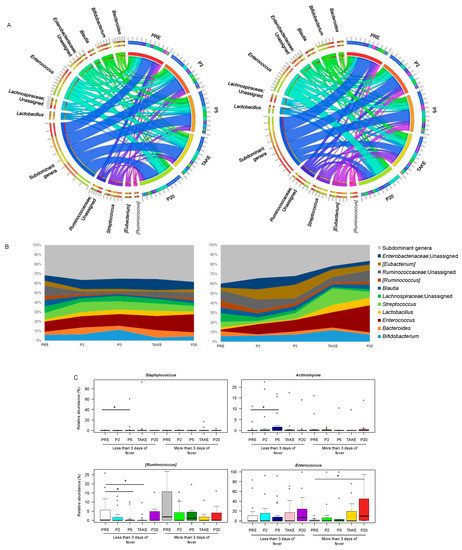 Genus-level gut microbiota trajectory in pediatric allo-HSCT patients with different duration of febrile neutropenia. Circos (A) and area (B) plots showing the relative abundance over time of the major genera in the GM of patients with less than or equal to (left) vs. more (right) than three days of fever. Only taxa with mean relative abundance > 20% in at least five samples of the total dataset are shown. PRE, before transplant; P2, at the onset of neutropenia (day −2/+2); P5, at the onset of fever (day +4/+5); TAKE, at engraftment; P20, after engraftment (day +20/+30); (C) Boxplots showing the relative abundance distribution of genera significantly differentially represented over time in patients with different duration of fever. Wilcoxon test, * for p < 0.05.