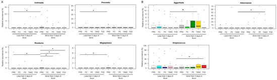 Early and late gut microbiota signatures of febrile neutropenia duration. Boxplots showing the relative abundance distribution of genera significantly differentially represented between patients with less than or equal to vs. more than three days of fever, before transplant (A) and after the onset of fever (B). PRE, before transplant; P2, at the onset of neutropenia (day −2/+2); P5, at the onset of fever (day +4/+5); TAKE, at engraftment; P20, after engraftment (day +20/+30). Wilcoxon test, * for p < 0.05.