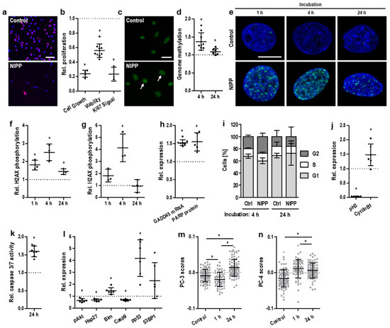 In Vitro NIPP treatment induces antiproliferative cell effects at different molecular interfaces. (a) Representative IF staining of Ki67 72 h after 30 s of NIPP treatment and (b) relative antiproliferative efficacy 72 h after 30 s of NIPP treatment), shown as relative decreases in cell number, cell viability, and Ki67 expression; the scale bar equals 40 μm. (c) Representative IF staining of 5mC 4 h after 30 s of NIPP treatment and (d) relative genomic methylation level per nucleus (number of foci normalized to the control) 4 (◆) and 24 h (■) after 30 s of NIPP treatment of cervical cancer cells; the scale bar equals 20 μm. (e) Representative IF microscopy of γH2AX and (f) relative γH2AX intensity and (g) relative γH2AX intensity 1 h, 4 h, and 24 h after 30 s of NIPP treatment of cervical cancer cells, indicating DNA double-strand breaks; the scale bar equals 10 μm. (h) Relative induction of growth arrest- and DNA damage-inducible genes GADD45 and PARP 72 h after 30 s of NIPP treatment. (i) Relative fractions of cells in 561 cell cycle phases S, G1 and G2 and with reversible phase transition to G2 4 h after 30 s of NIPP treatment. (j) Relative expression of the cell cycle factors phospho-histone H3 (Ser10) and CyclinB1 72 h after 30 s of NIPP treatment, indicating G2 arrest. (k) Relative caspase-3/7 activity 24 h after 30 s of NIPP treatment. (l) Relative expression of the apoptotic factors pAkt, Hsp27, Bim Casp9, pp53, and 53BP1 24 h after 30 s of NIPP treatment. (m) PC-3 and (n) PC-4 score values for single-cell Raman microspectroscopy of untreated and 30 s NIPP-treated cervical cancer cells after 1 and 24 h, as assessed by PCA; the data for each group originate from 3 independent experiments with 30 cells each. Results are expressed as mean ± SD; (a–l): * p < 0.05; paired t test; (m,n): one-way ANOVA; * p < 0.05).