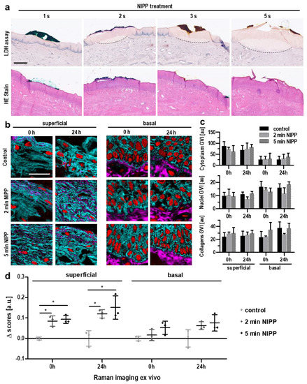 Ex vivo NIPP treatment maintains tissue morphology but shows transmucosal penetration and immediate effects on cell physiology. (a) Representative lactate dehydrogenase (LDH; upper row) and hematoxylin-eosin (HE, lower row) staining of cervical tissues after treatment with NIPP at different doses; the scale bar equals 200 μm. (b) Raman intensity distribution heatmaps assigned to collagen I (pink), nuclei (red) and cytoplasmic proteins (light blue) immediately and 24 h after ex vivo NIPP treatment of cervical tissue for 2 and 5 min; the scale bar equals 50 μm. Images were acquired 583 from the basal and superficial tissue layers. (c) The gray value intensities (GVIs) of the Raman images assessed in (b) revealed no quantitative differences between treated and untreated tissues. (d) Statistical comparison of the nuclear spectra obtained in (b) was performed by PCA and subsequent normalization of the PC score values to the control samples to assess qualitative differences in nuclear composition; the data points represent average score values per donor (n = 3). Results are expressed as mean ± SD; two-way ANOVA; * p < 0.05).