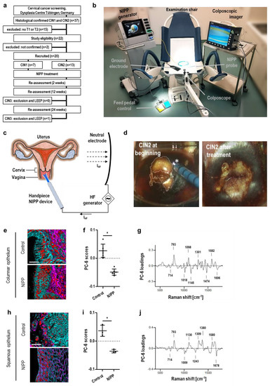 In vivo NIPP treatment and evaluation of molecular tissue effects, penetration depth and clinical efficacy. (a) Trial flow chart of patient recruitment and study visits for the prospective clinical study. (b) Setup of in vivo NIPP treatment. (c) Schematic of the anatomical view of the human cervix. As the uterine portion of the vaginal cavity, the cervix is easily accessible for NIPP treatment. (d) Colposcopic image of a human cervix after staining with 4% acetic acid and Lugol’s iodine at beginning (left) and after (right) NIPP treatment (30 s/cm2). The transformation zone is completely visible (T1 transformation zone; dashed line). The NIPP effluent is marked by an asterisk. (e–j) Columnar (e–g) and squamous (h–j) epithelium of tissue sections from patients treated with NIPP in vivo at 30 s/cm2 and tissue biopsies before treatment (control) were analyzed by Raman imaging. (e,h) Nuclei (red), collagen I (pink) and cytoplasmic proteins (light blue) were localized by TCA; the scale bar equals 50 μm. (f,i) The nuclear spectra obtained in (e,h) were processed by PCA, and the average PC score values of each patient (◆) were statistically compared (mean ± SD; paired t test; * p < 0.05). (g,j) Underlying biochemical information was interpreted based on relevant spectral signatures elaborated in the loading plot.