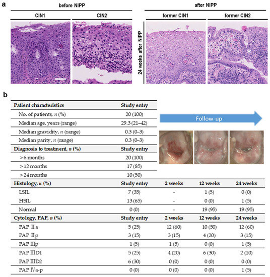 Study results. (a) Representative histopathological images of a CIN1 a CIN2 lesion before and 24 weeks after NIPP treatment within the prospective clinical study; the scale bar equals 50 μm; the asterisk marks the junction between squamous and columnar epithelium. (b) Clinical, histopathological and cytological features of patients before and 2, 12 and 24 weeks after NIPP treatment.