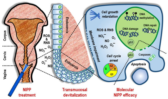 NIPP treatment results in tissue-preserving cross-mucosal tissue penetration and devitalization. The efficacy of NIPP is most likely explained by the rapid but transient DNA damage, with consequent inhibitory impacts on the cell cycle, metabolism and cell proliferation. This leads to the initiation of the apoptotic machinery. The ability to noninvasively cure CIN1/2 in vivo indicates the potential of NIPP application for the well-tolerated treatment of CIN3 and other neoplasia.