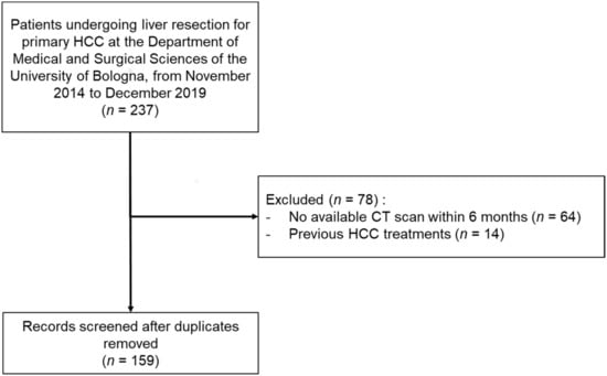 All patients undergoing liver resection for primary HCC consecutively enrolled at the Department of Medical and Surgical Sciences of the University of Bologna, Bologna, Italy from November 2014 to December 2019 were included in this study. Patients with an available preoperative abdominal CT-scan performed within three months prior to surgery were finally included in the study. We excluded patients undergoing other intra-operative treatments, such us radiofrequency ablation, or that had other malignant tumors or metastatic disease and those without preoperative CT images (e.g., patients with CT-scan performed in other centers or with magnetic resonance imaging) or incomplete medical records. After enrollment, demographic and clinical data from medical records were collected, including pre-operative laboratory tests, LSM measurements, tumor-related characteristics, sarcopenia assessed on an abdominal CT-scan, 30-days post-operative complications, and mortality. The types and extent of liver resection were also registered. The study was conducted following the Helsinki Declaration and approved by the local Ethical Committee.