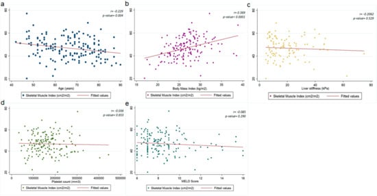 Correlation between sarcopenia by skeletal muscle index (SMI) and: (a) age, (b) body mass index (BMI), (c) liver stiffness measurement (LSM), (d) platelet count and (e) Model for end-stage liver disease (MELD). r = Spearman’s Rho.