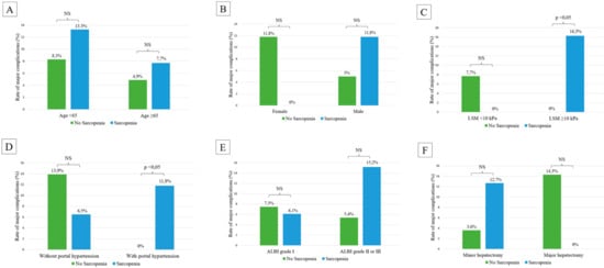 Rate of major complications according to the following sub-groups analysis: (A) age, (B) gender, (C) liver stiffness measurement (LSM), (D) portal hypertension, (E) albumin-bilirubin (ALBI) grade, (F) extent of hepatectomy.