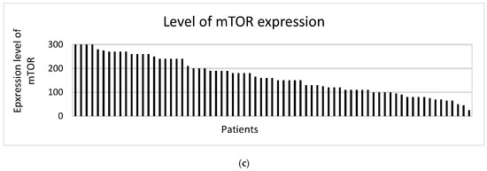 The mTOR pathway was activated in all patients, with high scores of mTOR expression in IHC (between 200 and 300) in 24 patients (33.8%). The median IHC score of mTOR was 160 (Figure 1 and Figure 2).