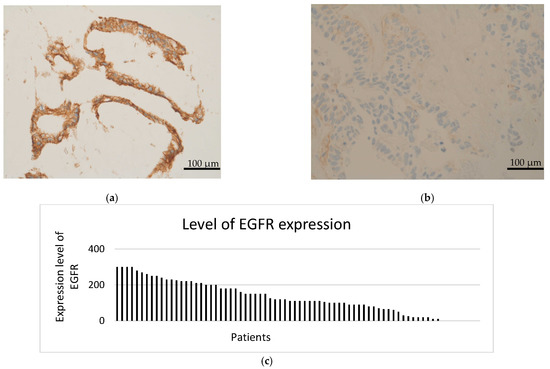 (a) Representative image of high expression of EGFR (IHC score = 300). (b) Representative image of low expression of EGFR. (Images by kind courtesy of Prof. Dr. Müllauer). (c) Level of EGFR expression in 71 patients with therapy−refractory solid tumors. Scale bar = 100 μm.