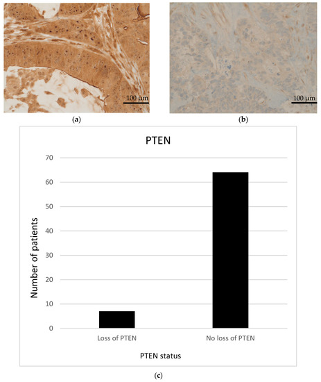 (a) Representative image of high expression of PTEN (IHC score = 300). (b) Representative image of low expression of PTEN. (Images by kind courtesy of Prof. Dr. Müllauer). (c) Loss of PTEN in 9 out of 71 patients with therapy−refractory solid tumors. Scale bar = 100 μm.