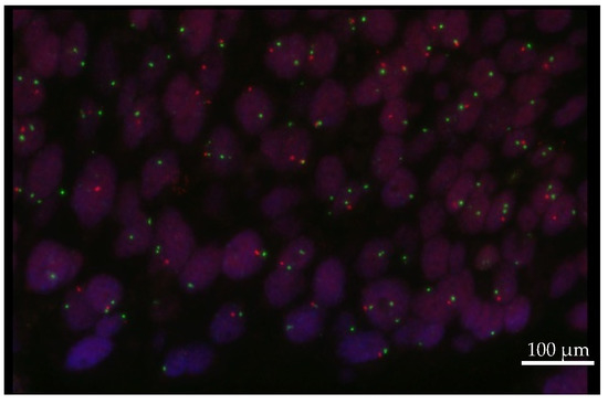 FISH image of heterozygous loss of PTEN. The red signal represents PTEN (chromosome location 10q23), and the green signal represents centromere 10. In the case of a heterozygous deletion, one red signal (10q23) is accompanied by two green signals in the nucleus. (Image by kind courtesy of Prof. Dr. Müllauer). Scale bar = 100 μm.