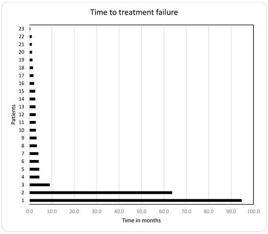 The median time to treatment failure (TTF) in the 23 patients who were treated with the mTORC1-inhibitor-based therapy was 2.8 months (0.4–94.7 months; Figure 5 and Table 4).