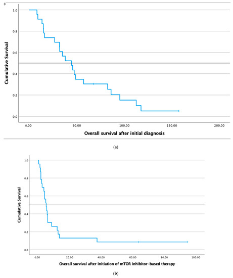 (a) Kaplan–Meier survival curve demonstrating overall survival (OS) after initial diagnosis of the solid tumor and (b) Kaplan–Meier survival curve showing OS after the beginning of the mTORC1-inhibitor-based therapy in 23 patients.