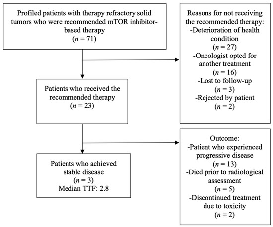 Three patients (4.2%) were lost to follow-up after the suggestion of the molecular-driven targeted therapy. In total, 45 patients (63.4%) were not treated with the mTORC1-inhibitor-based therapy for different reasons, including rapid deterioration of the general health condition (n = 27; 38.0%), preference of the treating oncologist for an alternative treatment (n = 16; 22.5%), and refusal of further treatments by the patient (n = 2; 2.8%). Figure 7 depicts the patient flow.