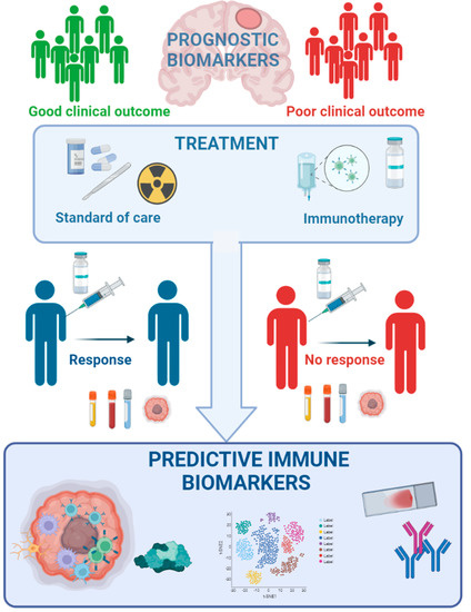 From the different studies discussed with various types of immunotherapy, including ICB, vaccines and CAR T-cell therapy, it is clear that there are immune correlates that associate with a clinical response. In GBM, the assessment of response to immunotherapy relies basically on magnetic resonance imaging (MRI); however, this technology does not allow discrimination between real tumour progression and therapy-induced inflammation (pseudo-progression). Currently, in GBM, the tumour biopsy is used to confirm the disease progression; however, this is a risky intervention considering the location of GBM. Therefore, the validation of novel biomarkers predicting clinical responders is important (Figure 2). For obvious reasons, non-invasive methods of biomarker assessment in peripheral blood would be highly desirable, but at the moment, there are no real blood-based biomarkers for GBM available [131]. Numerous immunological correlates with successful ICB treatment in other cancers could also be relevant for GBM, but these still require further development for use in patient stratification [3,132,133,134,135].