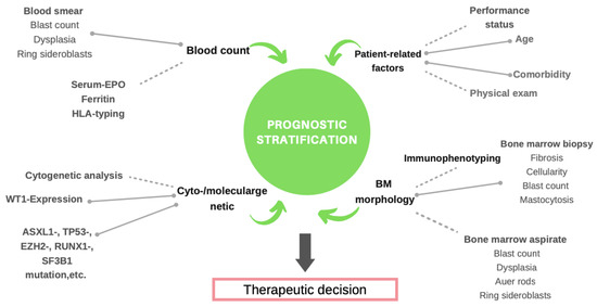 Parameters reflecting increased cell turnover, such as elevated LDH, thymidine kinase, and beta2-microglobulin, have long been known as prognostic parameters [6,10]. Serum ferritin (SF), reflecting storage iron, has also been shown to be a prognostic factor. Elevated SF indicates transfusional iron overload, which is prognostically relevant because it is a surrogate marker for hematopoietic insufficiency as well as iron-related organ damage. If detected at diagnosis, elevated SF may result from increased intestinal iron uptake due to down-regulation of hepcidine as a consequence of ineffective erythropoiesis [11,12,13,14]. It is plausible that parameters indicating inflammation and/or an impaired bone marrow microenvironment, such as increased C-reactive protein (CRP), erythrocyte sedimentation rate (ESR), or S100-A9 [15], have a prognostic impact as well. In addition, the assessment of marrow cellularity by cytology, or more reliably by histopathology, yields prognostic information: patients with a hypercellular marrow, partly arising from an unsuccessful attempt at compensating for peripheral cytopenias, fare worse than patients with a normo- or hypocellular marrow [16,17,18]. Marrow fibrosis has prognostic implications since it is associated with more pronounced hematopoietic insufficiency, a higher risk of clonal evolution, and more frequent progression to AML [19]. The degree of dysplasia in blood and bone marrow can also be utilized for prognostication [20]. Multilineage dysplasia is related to impaired differentiation, intramedullary apoptosis, and hematopoietic insufficiency.