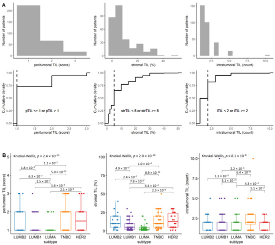The distribution of TIL categories across the analyzed cases: (A), The distribution of patients (n = 309) in the different TIL localization categories. Patients were stratified based on the thresholds indicated with vertical lines for subsequent analyses. (B), The distribution of peritumoral, stromal and intratumoral TILs in different breast carcinoma subtypes (n = 305). Only pairwise comparisons with Wilcoxon-test p-values less than 0.100 are shown.