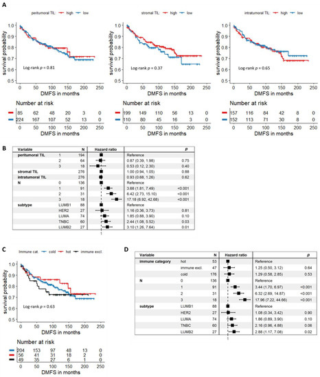 Additionally, we also grouped the tumors based on their immune category (hot, cold, and immune excluded). This categorization resulted in 204 cold tumors, 56 hot tumors and 49 immune-excluded tumors. There is a very slight survival benefit for hot tumors vs. cold tumors in a univariate setting, but this trend could not be verified as significant. Immune-excluded tumors behave very similarly to cold tumors in terms of DMFS probability (Figure 2C). Fitting a multivariate Cox-regression model similar to that of Figure 2B, but using the distinct immune categories instead of actual TIL levels at different localizations shows the lack of prognostic significance of the immune category of the tumor (Figure 2D).