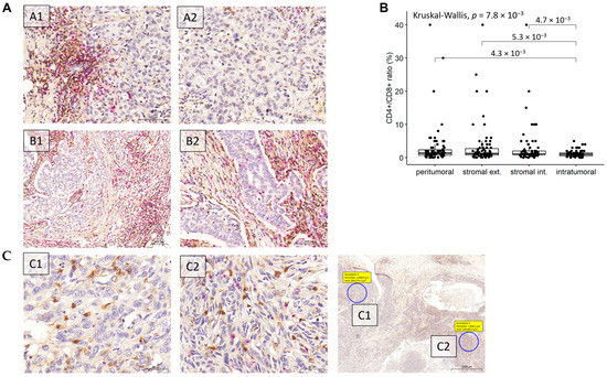 Given that the amount of CD4+ and/or CD8+ lymphocytes was measured in different units at different localizations, only CD4+/CD8+ ratios were compared between tumor regions (Figure 3B). The comparison resulted in a significant global Kruskal–Wallis p-value of 0.0078 with a significantly lower CD4+/CD8+ ratio measured at intratumoral localization than in either of the other three regions (Wilcoxon p = 0.0043 compared with peritumoral, p = 0.0053 compared with stromal external and p = 0.0047 compared with stromal internal regions).