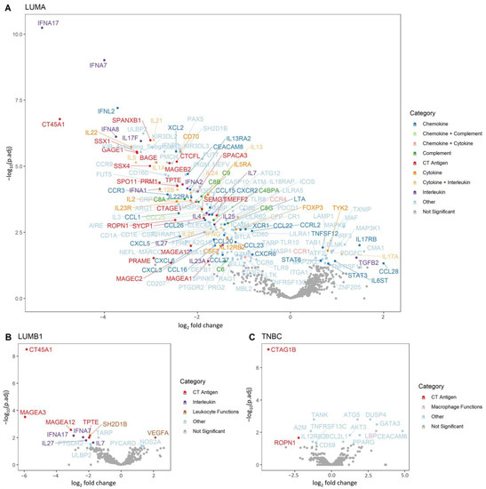 Differential expression analysis of immune genes (n = 730) in Met vs. Ctrl comparison for three breast carcinoma subtypes. Results are shown separately for each subtype: (A), LUMA, (B), LUMB1 and (C), TNBC. The x-axis shows the log2 fold change between Met and Ctrl, and the y-axis shows −log10-transformed adjusted p-values from differential expression analysis. Genes that remained significant after Benjamini–Hochberg adjustment (adjusted p < 0.05) are colored according to a reduced list of immune response categories (highlighting only immune response categories that showed enrichment among the differentially expressed genes).