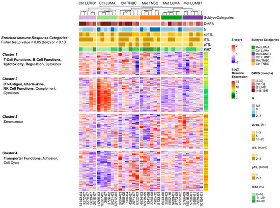 Additionally, an unsupervised hierarchical clustering of all 730 immune genes was performed to supplement the differential expression results (Figure 5). The heatmap shows that in case of luminal disease (LUMA and LUMB1 cases), Ctrl and Met samples tend to highly differ from each other, but they have similar gene expression profiles within Met vs. Ctrl groups, regardless of subtype. On the other hand, both Ctrl and Met TNBC cases form a distinct cluster. K-means clustering of the genes resulted in four clusters with diverse attributes. Cluster 1 shows a tendency for upregulation in Ctrl luminal as well as Ctrl and Met TNBC samples. Genes involved in T/B-cell functions, cytotoxicity and regulation are enriched in this cluster (one-sided Fisher’s exact test p < 0.001, p = 0.001, p = 0.003 and p = 0.018, respectively). Cluster 2 can be characterized by a high ratio of CT-antigens, interleukins and genes with NK cell functions (one-sided Fisher’s exact test p < 0.001, p < 0.001 and p = 0.033, respectively), and this group of genes exhibits increased expression in Ctrl luminal cases. In cluster 3, there is a weak enrichment for senescence-related genes (one-sided Fisher’s exact test p = 0.068), and can be characterized by genes with higher expression in the Met luminal samples. Lastly, cluster 4 shows an upregulation in TNBC samples, and representatives of immune genes with transporter, cell adhesion and cell cycle regulation function are overrepresented (one-sided Fisher’s exact test p = 0.002, p = 0.060 and p = 0.073, respectively). The cluster assignment for each gene and the overrepresentation analysis results can be found in Table S2.