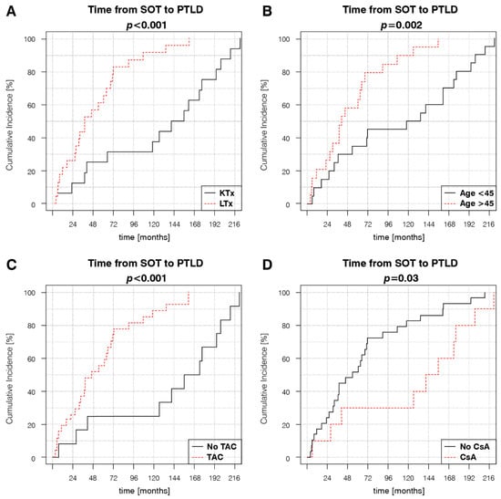 Factors influencing the dynamic of PTLD development in the SOT group: (A) organ type, (B) age at transplantation, (C) use of TAC in the maintenance IS regimen at the time of PTLD diagnosis, and (D) use of cyclosporin in maintenance IS at the time of PTLD diagnosis. p-values represent the log-rank analysis of the Kaplan–Meier estimator curves.