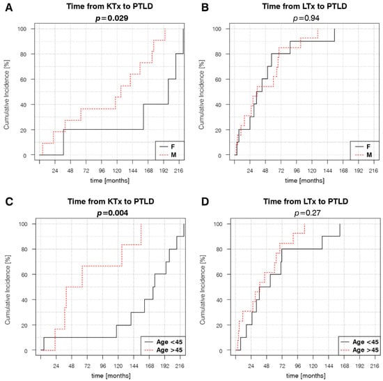 To date, data on the role of patients’ sex in PTLD development in SOT recipients are limited. Moreover, sex analyses are mostly associated with patient survival []. The impact of different immunosuppressive agents on the PTLD time of onset and patients’ survival has been a subject of debate. Large registry studies have shown contradictory effects of TAC use with PTLD development in KTRs: Bustami et al. reported an increased risk of PTLD in first-time KTRs without antibody induction [], whereas Francis et al. described a decreased risk of PTLD []. Additionally, a combination of MMF and CsA use is associated with a lower PTLD risk in KTRs []. Despite the statistical significance of TAC use in later PTLD onset among LTRs, it must be underlined that 21 out of 23 patients in this group received TAC and only 2 received CsA. However, the p-value of this analysis was p = 0.04. This observation should be validated on larger cohorts of LTRs taking TAC or CsA. Additionally, the significantly higher number of patients treated with TAC in the LTR group, who tend to develop PTLD earlier than KTRs in our cohort, might have affected the Kaplan–Meier estimator curve analysis of the effect of TAC on the time to PTLD diagnosis in the SOT group. We consider this as a possible limitation of this analysis.