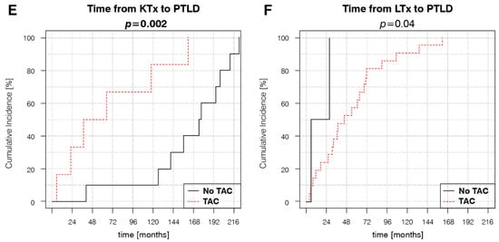 Transplanted organ-dependent effect of different variables on PTLD development: (A) KTR sex, (B) LTR sex, (C) KTR age at transplantation, (D) LTR age at transplantation, (E) Presence of TAC in KTR IS regimens at PTLD diagnosis, (F) Presence of TAC in LTR IS regimens at PTLD diagnosis. p-values represent the log-rank analysis of the Kaplan–Meier estimator curves.