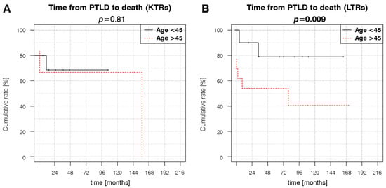 KTRs > 50 years of age at transplantation have an increased risk of late-onset PTLD (HR = 1.28) []. Our results show a marked risk increase (HR = 5.21) at a younger cut-off age of 45 years at kidney transplantation. Additionally, age > 55 years was previously reported to negatively impact the survival of KTRs with PTLD [], which is not supported by our data in the KTR group. We consider the improved survival of LTRs < 45 years at liver transplantation a novel finding, as most studies analyzing the prognostic factors for LTRs are based on pediatric or mainly pediatric cohorts and describe an inverted age–PTLD association, where adult recipients demonstrate improved survival. In a paper by Fararjeh et al. [], age was not a significant factor in the survival of adult LTRs.