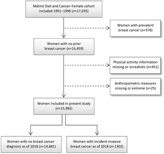 Women were excluded from the present study if having prevalent breast cancer (n = 576), missing or unrealistic physical activity reports (n = 451, including two individuals with >16 h activity/day), and missing or extreme anthropometric measures (n = 25, including one woman with a waist circumference of 50 cm and a BMI of 34.6 kg/m2, and one woman with a waist circumference of 841 cm). The remaining 15,983 women were included in the present study (Figure 1).