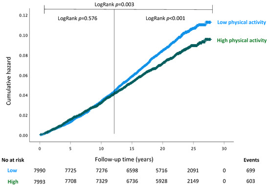The cumulative hazard of invasive breast cancer between women with different physical activity levels was estimated with Kaplan–Meier curves (Figure 2). While the high physical activity group had an overall lower breast cancer hazard (LogRank p = 0.002), the hazards of low and high physical activity groups followed a non-proportional pattern which had a negligible difference in the early period (0–11 years; LogRank p = 0.576), whereas there were evident differences in the late period (12+ years; LogRank p < 0.001).