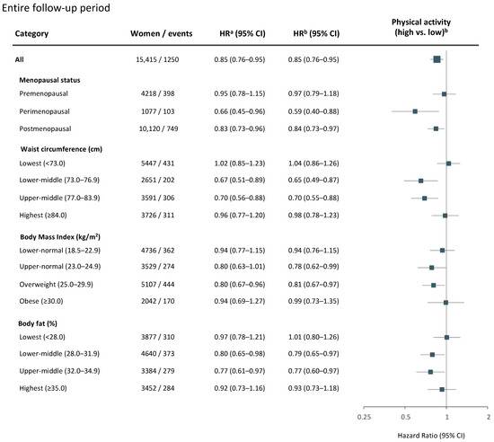 Physical activity and long-term (12+ years) risk of breast cancer. Age- and multivariable-adjusted hazard ratios (HR) with 95% CI for a high versus low level of physical activity among all women, and by menopausal status or body composition. Women and breast cancer events shown represent the numbers available in the multivariable model. The forest plot illustrates multivariable-adjusted HR with 95% CI. a Model adjusted for age at baseline. b Multivariable model adjusted for age at baseline, age at menarche, parity, age at first childbirth, oral contraceptive use, current hormone replacement therapy use, socioeconomic index, and alcohol consumption. Models for all women or stratified by body composition (waist circumference, BMI, or body fat percentage) were additionally adjusted for age at menopause.