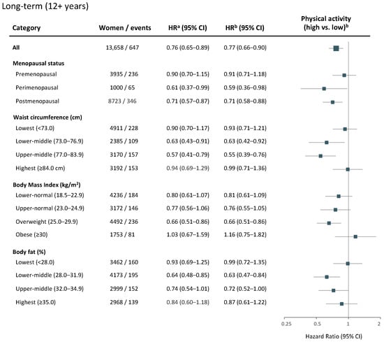 Due to the discrepant effects observed in the early vs. late follow-up periods, separate regression analyses were conducted according to the short-term (0–11 years) and long-term (12+ years) benefits of physical activity. In the short term, no clear associations between physical activity and breast cancer risk were observed overall (HRadj = 0.96, 95% CI 0.82–1.12), or within subgroups by menopausal status or body composition (Figure 4).