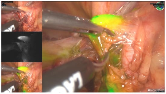 All women underwent staging surgery either via laparotomic, laparoscopic, or robotic approach. The choice of surgical method was at the surgeon’s discretion and personal financial consideration. The standard staging procedures included total hysterectomy, bilateral salpingo-oophorectomy, lymph node assessment and dissection, biopsy of any suspicious lesions, and peritoneal or ascites cytology. Omental biopsy was performed in those with serous carcinoma, clear cell carcinoma, or carcinosarcoma histologies. SLN mapping and/or robotic surgery were performed on women who could afford the additional medical cost incurred by the application of the endoscopic fluorescence imaging system (PINPOINT, Novadaq, Mississauga, ON, Canada) for SLN mapping, and the da Vinci Si Surgical System (Intuitive Surgical, Inc., Sunnyvale, CA, USA), since these costs are not covered by the National Health Insurance in Taiwan. Para-aortic lymphadenectomy was done at the discretion of the attending surgeon based on the presence of risk factors such as high-risk histologies, suspicious nodal status, deep myometrial invasion, the presence of extra-uterine disease, or the presence of positive para-aortic SLN mapping. In the SLN group, indocyanine green (ICG) tracer was diluted to a dose of 2.5 mg/mL and injected into the cervix at 3 o’clock and 9 o’clock positions. At each position, 1 mL of ICG tracer was injected to cervical submucosa (1 cm in depth) and deep cervical stroma (3 cm in depth) respectively, achieving a total volume of 4 mL. Detection of SLN was accomplished by visualization of colored lymph nodes via the endoscopic fluorescence imaging system (Figure 1). The protocol for SLN mapping in our institution was adopted from the SLN algorithm developed by the Memorial Sloan Kettering Cancer Center []. All mapped SLNs and grossly enlarged suspicious nodes, regardless of mapping, were removed. A side specific pelvic lymphadenectomy (including external iliac, internal iliac and obturator region) was performed if mapping failed on a hemipelvis [].